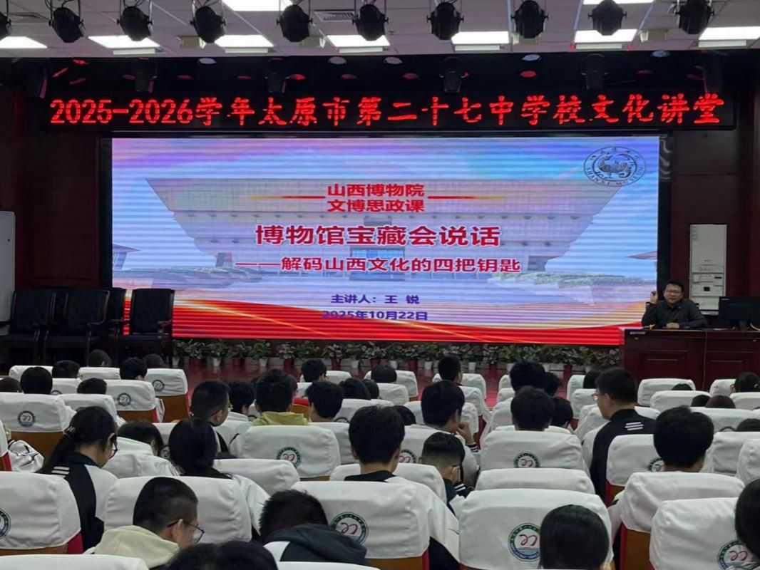 10月22日,“博物馆宝藏会说话——解码山西文化的四把钥匙”课程在太原市第二十七中学校顺利完成首讲。课程主讲人马克思主义学院教师王锐以山西省博物院的多件镇馆之宝为线索,从山河钥匙:黄土与大河的塑造、根祖钥匙:华夏文明的“基因实验室”、匠心钥匙:传统技艺的活态传承、烟火钥匙:饮食里的生活哲学共四个方面为二十七中学校的约200名师生解读了山西文化的深刻内涵,得到了在场师生的广泛好评。