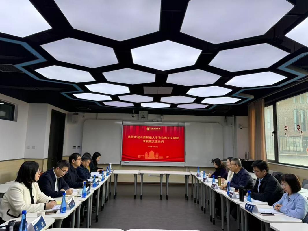 为进一步加强高校马克思主义学院之间的交流与合作,提升思政课教学质量和马克思主义理论学科建设水平,近日学院院长杨茂林带队赴中央财经大学马克思主义学院开展交流共建,副院长郭永园、工会主席王娟、团委书记任智萍和办公室主任张小丽随行。中央财经大学马克思主义学院党委书记李爱民、院长黄刚、副院长赵付科及部分骨干教师出席座谈会。