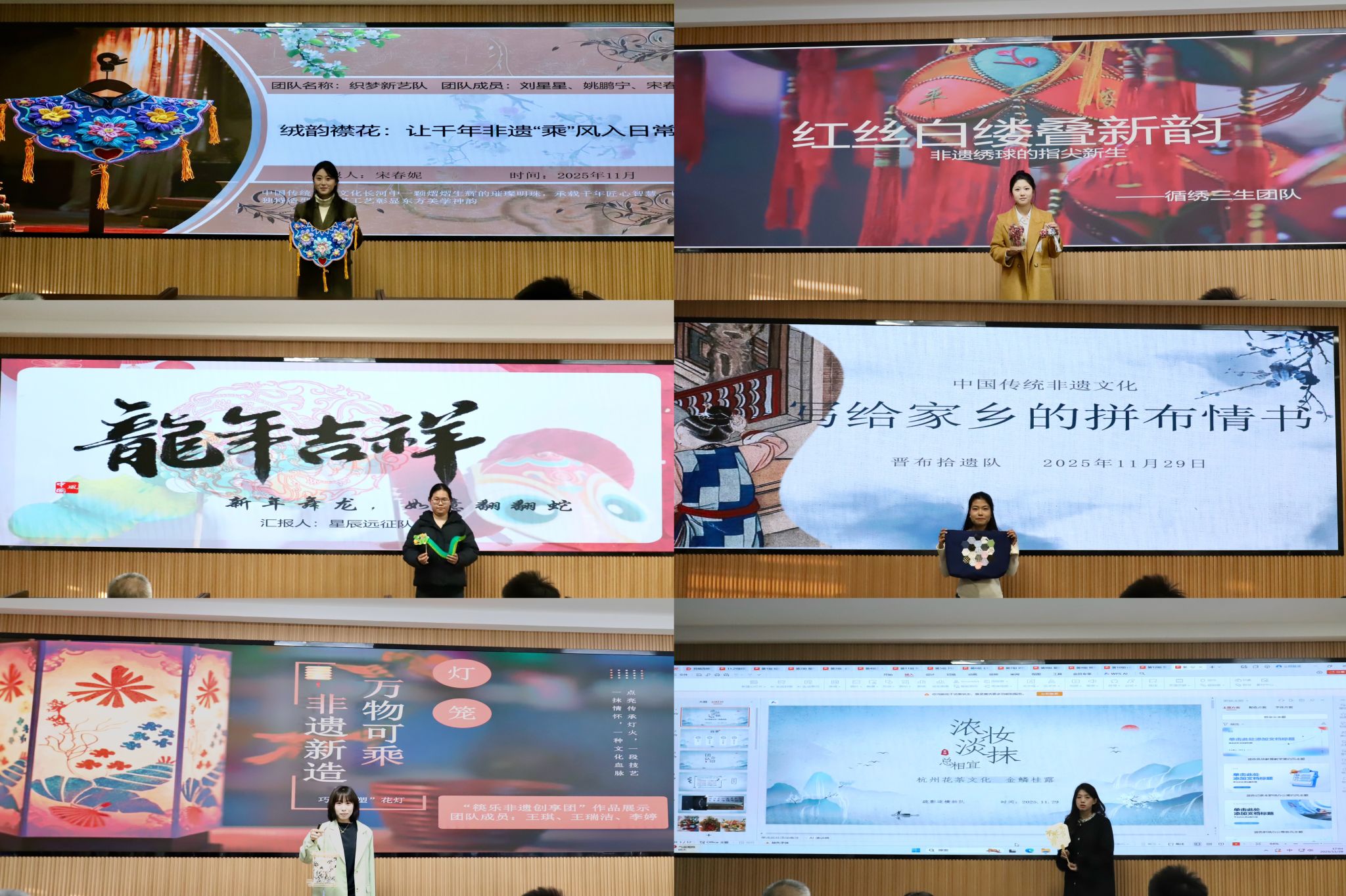 非遗焕新,创意破界。本次大赛自启动以来,得到广大学生积极响应,历经初赛严格筛选,13组作品脱颖而出。参赛选手以非遗技艺为根基,紧扣时代脉搏,将纸编、剪纸、中药炮制、螺钿、拼布等传统工艺与现代生活需求相结合,打造出兼具文化内涵与实用价值的创意作品。经纬墨痕队的纸编挂饰与书签,以“变废为宝”的生态智慧诠释勤俭节约的传统美德。福气满满队的剪纸“福”字,融合牡丹、锦鲤、石榴等吉祥元素,传递富贵安康的美好祈愿。草木山河队以中药炮制技艺为核心,构建本草地理美学图景,实现非遗与跨学科设计的创新融合。龙凤呈祥队的镂空光影灯,将龙凤吉祥符号与现代照明功能结合,让传统文化融入日常起居。此外,螺钿发簪、千里江山图纸雕灯、绒花云肩、咖啡袋绣球、拼布等作品,有的巧用环保材料传递生态理念,有的融入科技元素契合时代节拍,有的创新表现形式焕发非遗活力,生动诠释了“非遗新造”的深刻内涵。比赛现场,选手们通过PPT展示、实物演示等方式,详细阐述创作理念、制作工艺与文化价值,展现出青年一代对中华优秀传统文化的深刻理解与创新表达。