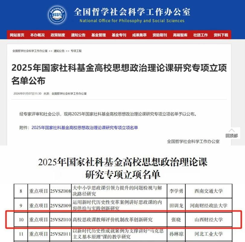 近日,全国哲学社会科学工作办公室公布了国家社科基金高校思想政治理论课研究专项立项名单,共立项185项,其中重点项目27项。我校马克思主义学院张晓教授获批重点项目“高校思政课教师评价机制改革创新研究(批准号:25VSZ010),该项目既是山西省高校唯一的1项重点项目,也是我校国家社科基金高校思想政治理论课研究专项重点项目零的突破。